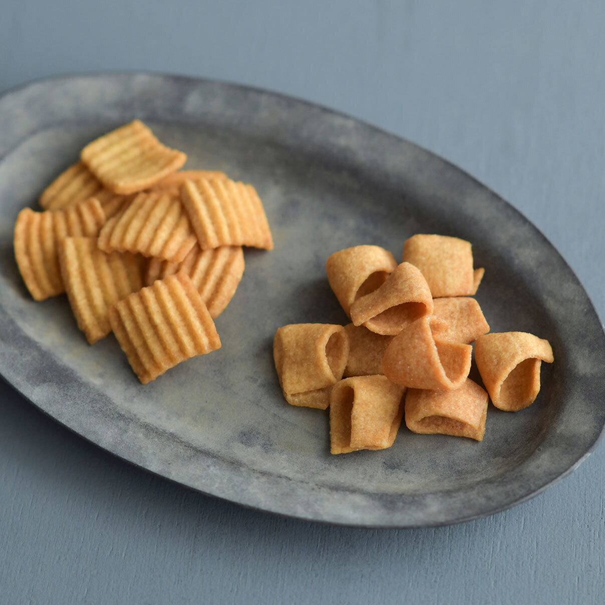 黒糖の穏やかな甘みがよく合う波形の「黒糖」、ほのかな塩味が後を引く半わっか形の「塩」の2種類。